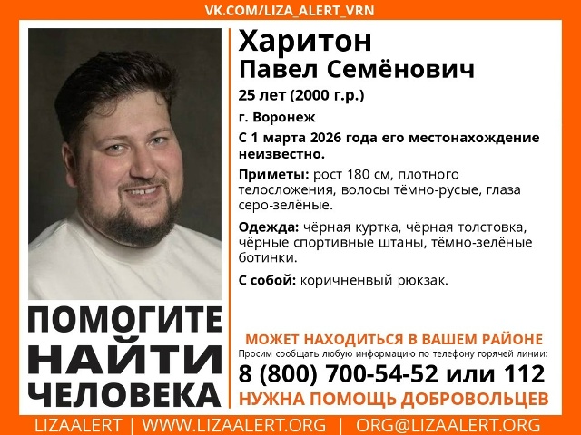 В Воронеже ищут пропавшего 25-летнего Павла Харитона. Об этом сообщили в поисковом отряде «ЛизаАлерт» вечером 2 марта. О местонахождении мужчины ничего не известно с 1 марта 2026 года.