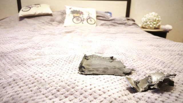 В квартире Екатерины на кровати лежит фрагмент крыла беспилотника, повсюду разбросаны осколки стекла. Девушка уже дала показания правоохранительным органам, они осмотрели повреждения в квартире.
