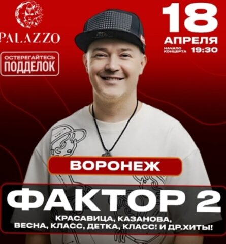 «Фактор 2» обещает перенести воронежцев в золотое время молодости. Илья Подстрелов и Андрей Камаев исполнят хиты «Скажи, красавица», «Весна», «Класс, детка, класс», «Казанова» и многие другие.