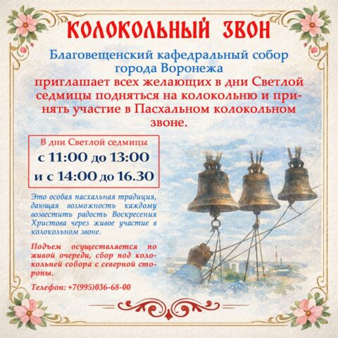 Благовещенский кафедральный собор Воронежа приглашает всех желающих подняться на колокольню и принять участие в праздничном звоне колоколов. Суббота – последний день Светлой седмицы, в который можно будет попробовать себя в качестве звонаря.