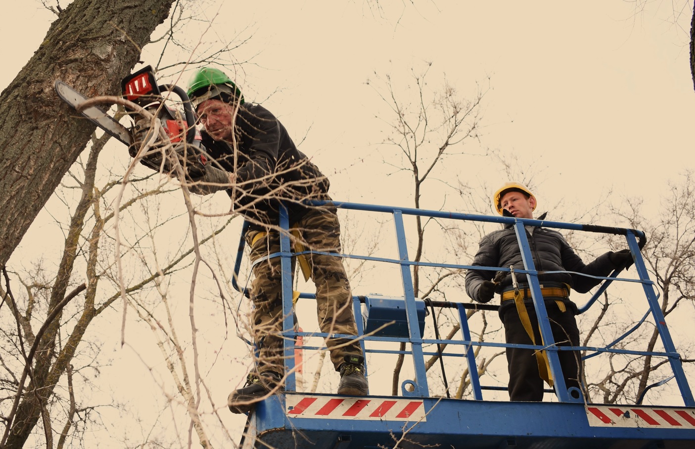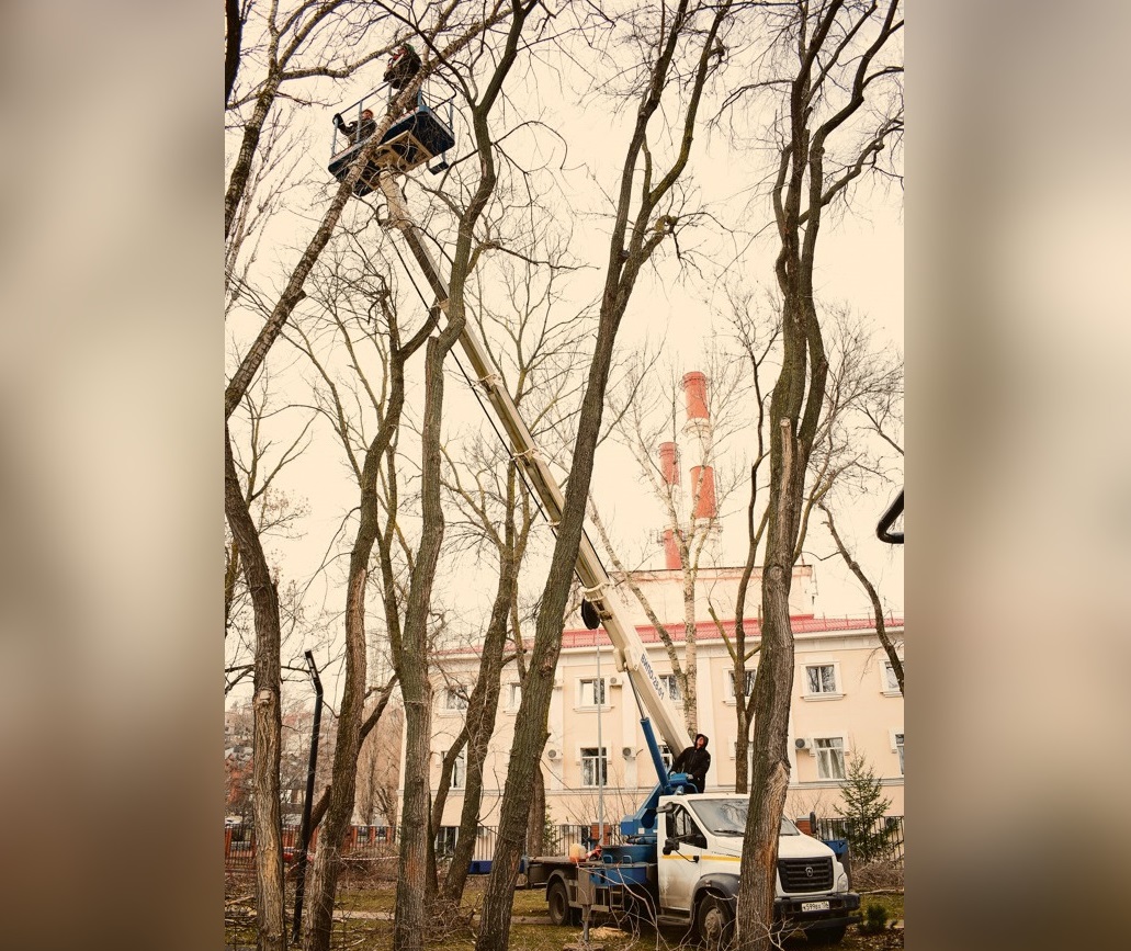 Недавно плановую обрезку деревьев провели рядом со спортивной площадкой на Петровской набережной. Здесь растут крупные вязы, каждому из которых не меньше 50 лет. Сухие ветки, которые подлежат удалению, находятся в 10-20 м от земли. Чтобы добраться до них, городские коммунальщики используют специальную вышку. В люльку помещаются два человека. Технике безопасности уделяют большое внимание: рабочие в касках пристёгнуты к кабине страховочными тросами, территория огорожена.
