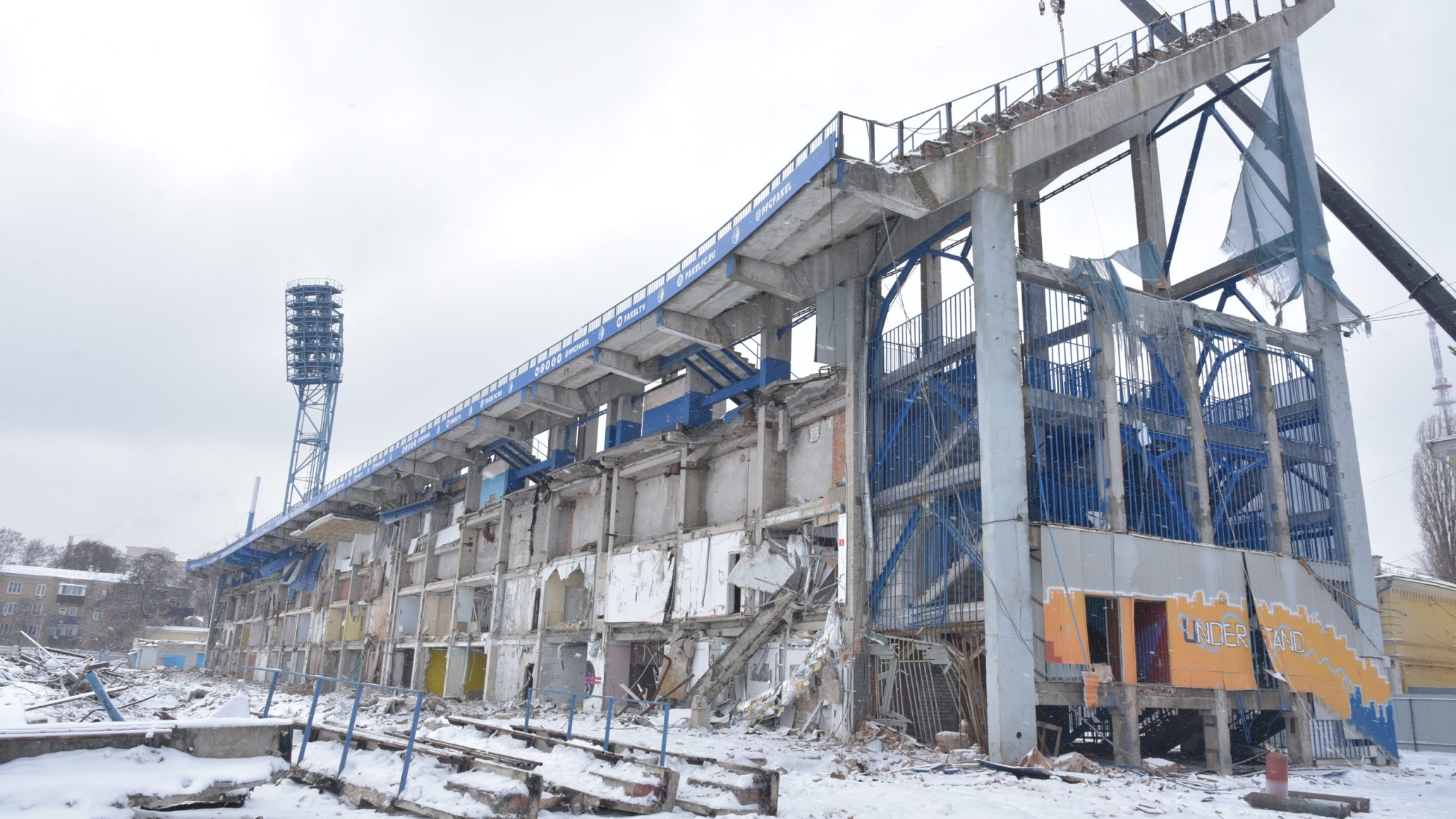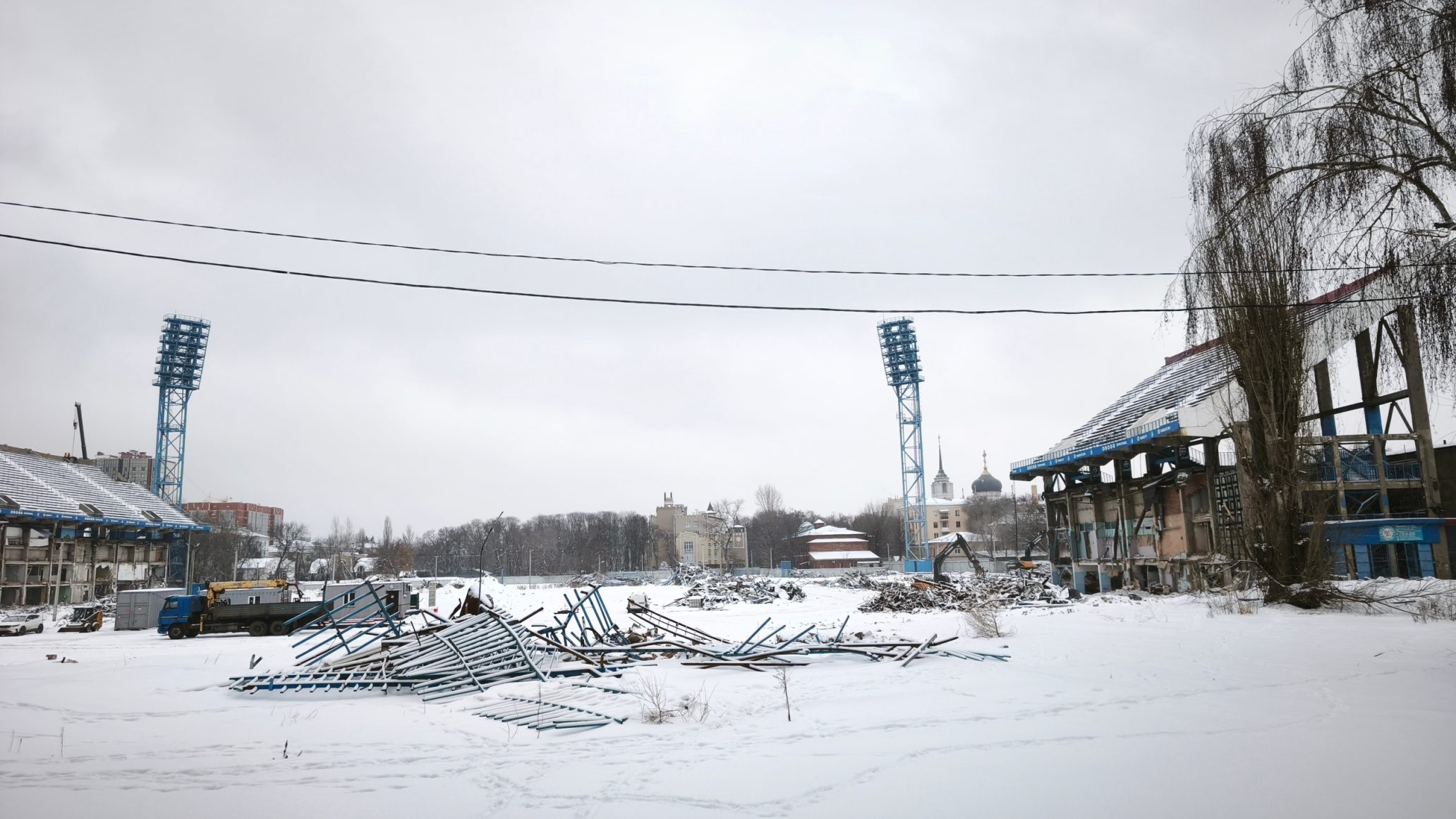 Главную спортивную арену Воронежа начали разбирать 28 ноября прошлого года. За два месяца работы продвинулись значительно — Северная и Южные трибуны снесены полностью, о Восточной напоминает лишь небольшой фрагмент. От Центральной трибуны, протянувшейся вдоль улицы Студенческой, сохранились верхние ярусы и помещения под ними. Сейчас эти конструкции разбирают с помощью подъёмного крана.