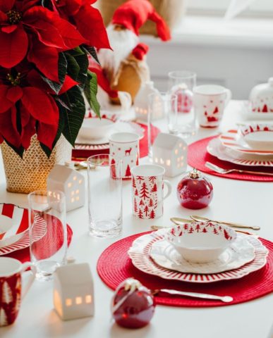 Посуду нужно выбрать в красно-белой гамме. Например, белые тарелки и красные чашки с белым рисунком (как вариант — в горошек). Дополнить эту жизнерадостную картину надо прозрачными бокалами и стаканами.