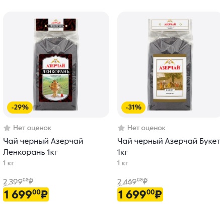 Такие цены в принципе подтверждаются и в сетевых магазинах. Так, за килограмм чёрного чая «Азерчай» придётся заплатить даже больше – 1699 рублей за килограмм, и то по скидке.