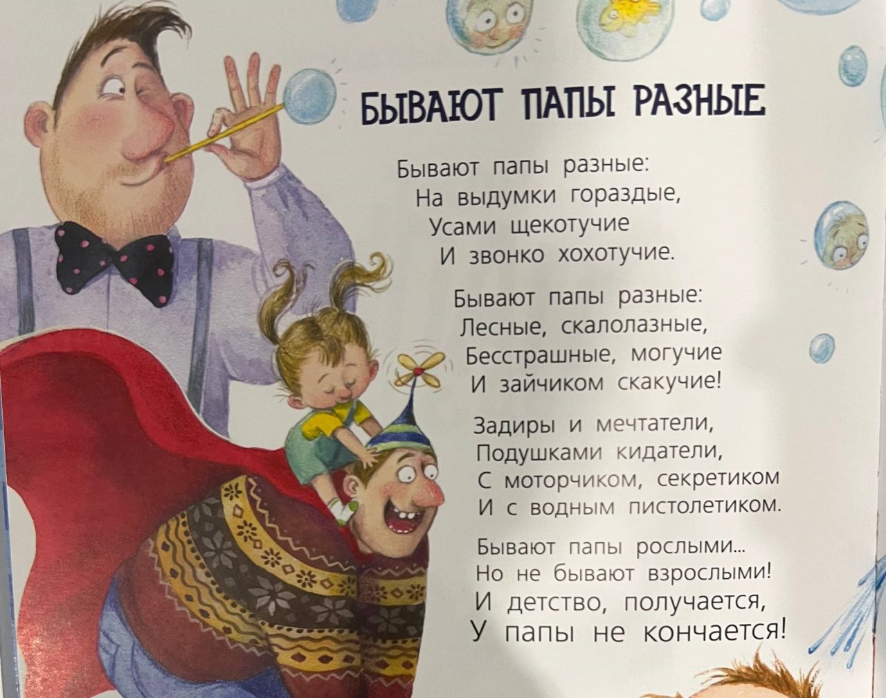 Самые подходящие строки можно найти у Илоны Грошевой в стихотворении «Праздник всех отцов», у Елены Весновой «Про папу от дочки» и у Ольги Рождественской «Лучше папы друга нет». Короткий и смешной стих у Татьяны Гусаровой «Очень папочку люблю» и более длинный, но очень хороший стих о том, как весело проводить с папой время у Самуила Маршака «Хороший день».