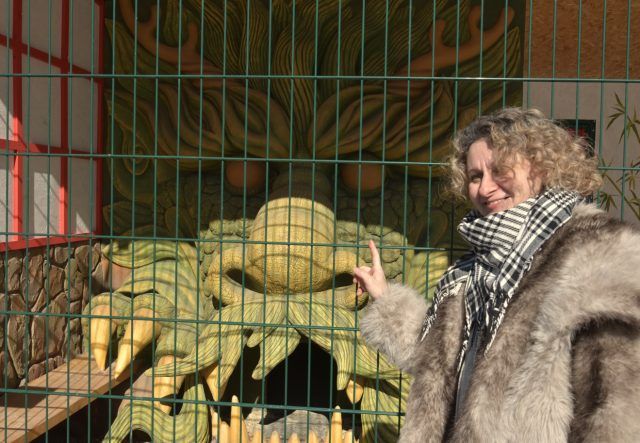 Рядом с вольером енотников недавно открыли вольер для лис, выполненный в китайской стилистике. В этому случае Ирина вдохновлялась китайскими мифами про лис-оборотней. Главное украшение китайского дворика — голова дракона — она же вход во внутреннее пространство вольера.