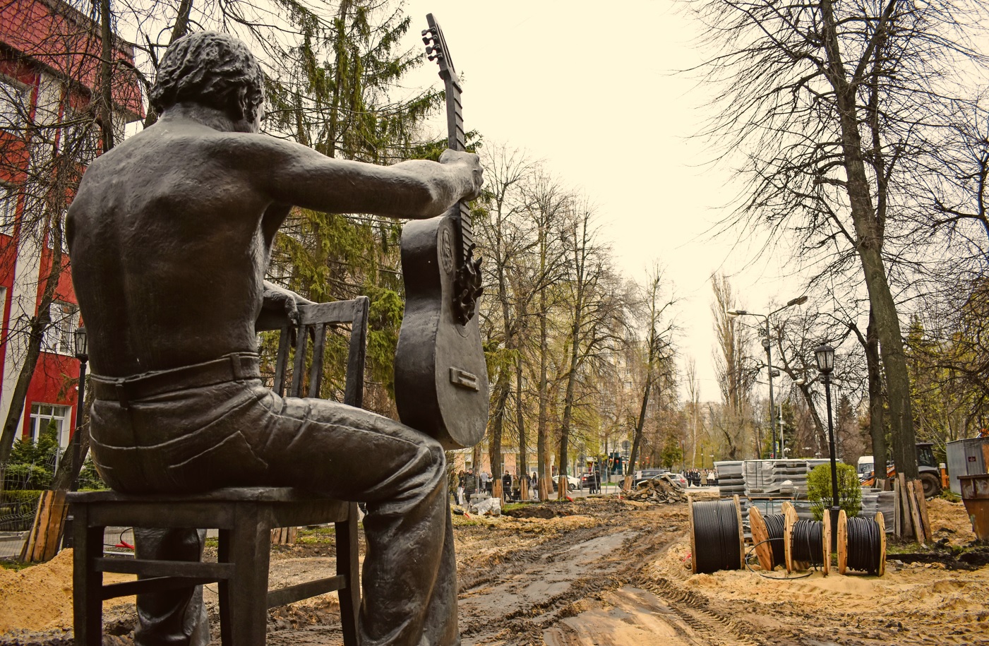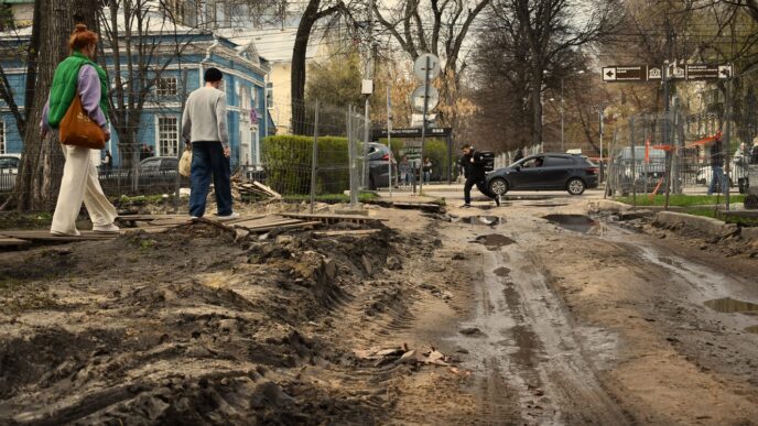 Перекопанная вдоль и поперёк улица мало напоминает прежний тихий пешеходный бульвар. Кругом трубы, провода, горы демонтированной плитки… Территория огорожена забором. По словам рабочих, находиться на объекте небезопасно. Из-за повышенной влажности легко увязнуть — даже трактор здесь проезжает с трудом.