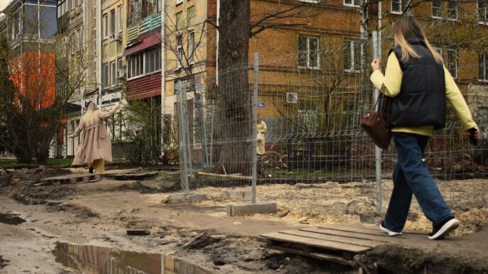 При этом рабочие постарались сделать так, чтобы воронежцы могли без проблем попасть в расположенные на участке дома, кафе и магазины. Для этой цели организованы обходные пути. Правда, уровень этой организации иногда вызывает вопросы. Вот популярная в городе кулинария – многие сотрудники ближайших офисов привыкли здесь обедать. Но теперь ради тарелки горячего супа придётся преодолеть целую полосу препятствий. По территории, которая не огорожена забором, пройти не получится – здесь образовалась огромная лужа. Деревянные настилы, которые подготовили рабочие, ситуацию не спасают. На наших глазах пенсионерка едва не упала в грязь, пытаясь удержаться на ненадёжном мостике.