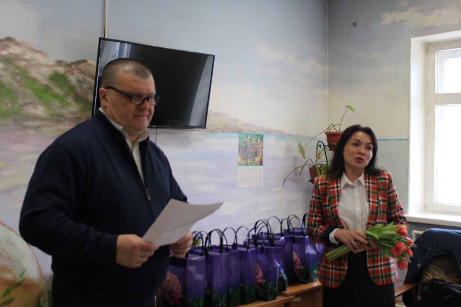 Но и без подарков от общественников не обошлось. Олег Черемушкин и Юлия Головко вручили девушкам кондитерские наборы и тюльпаны.