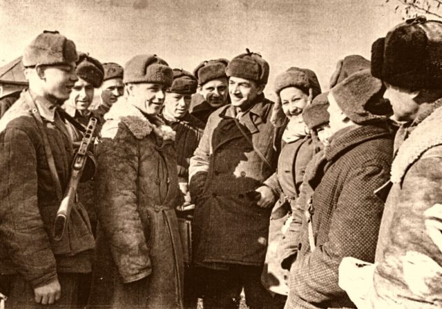 Варвара Обухова на Воронежском фронте в гостях у гвардейцев-миномётчиков, 1943 г.