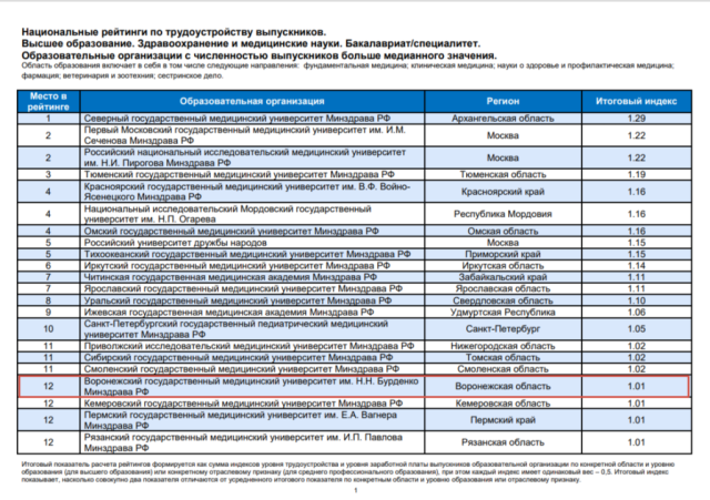 Воронежский государственный медицинский университет им. Н.Н. Бурденко занял 12-ю строчку с индексом 1.01, разделив рейтинговый индекс с Кемеровским, Пермским, Рязанским и Южно-Уральским ГМУ.