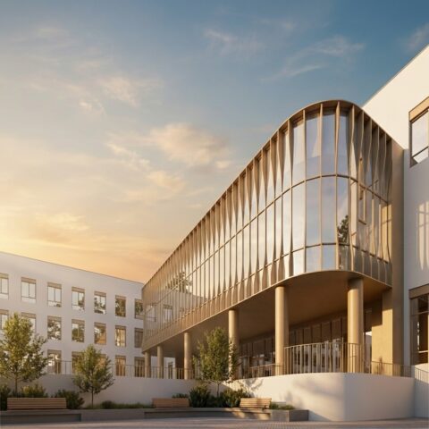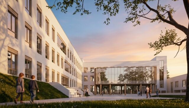 – Между школой и детсадом будет расположен внутренний двор для отдыха, игр и общешкольных мероприятий, – рассказывает главный архитектор проекта Алла Лалакина. – Фасады здания будут выполнены в сдержанной бело-бежевой гамме. Выступающий над главным входом стеклянный объём библиотеки придаст парадный вид центральной части здания.