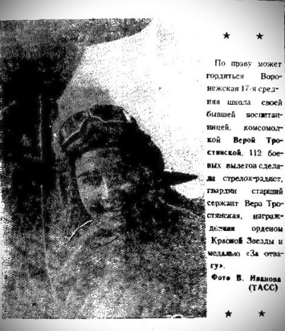 — В газете «Коммуна» от 8 марта 1944 года была опубликована фотография воспитанницы воронежской 17-й средней школы гвардии старшего сержанта Веры Тростянской, сделавшей 112 боевых вылетов в качестве стрелка-радиста. В заметке отмечалось, что Вера Тростянская награждена орденом Красной Звезды и медалью «За отвагу».