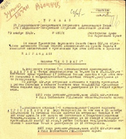В приказе о награждении медалью «За отвагу» В.Ф. Тростьянскую (фамилия написана через мягкий знак), отмечалось, что «с 15 октября 1943 года сделала 14 успешных боевых вылетов, ею уничтожено и повреждено: зенитных точек — 4, повозок с грузом — 9 и расстреляно до 50 солдат и офицеров противника….».