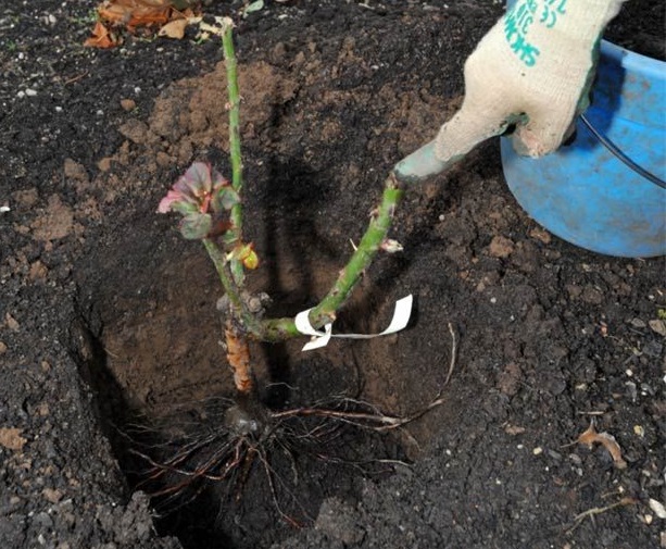 Куст предварительно обрезают (в первую очередь – одревесневшие ветки), чтобы сделать его более компактным и не сломать. Затем выкапывают с большим комом земли и пересаживают в яму, которая должна быть примерно на 15 см больше прикорневого объёма. На дно можно также насыпать удобрения, о которых писали выше. Место прививки должно быть под землёй на 3-5 см. Яму засыпают землёй, уплотняют и обильно поливают. После этого растения желательно притенить, то есть поставить навес с лутрасилом или марлевой тканью. Весной слишком активное солнце, которое может оставить ожоги и повредить растения.