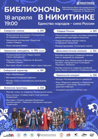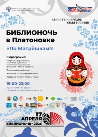 Каждая локация в библиотеке превратится в отдельную «Матрёшку» со своим характером. В программе – «Гастрономическая», «Воронежская», «Казачья» «Северная», «Уральская» и другие пространства. Прозвучат стихи народов России в исполнении воронежских поэтов, а любители ночных прогулок смогут погулять по Воронежу с гидом (начало экскурсии – в 22:00).