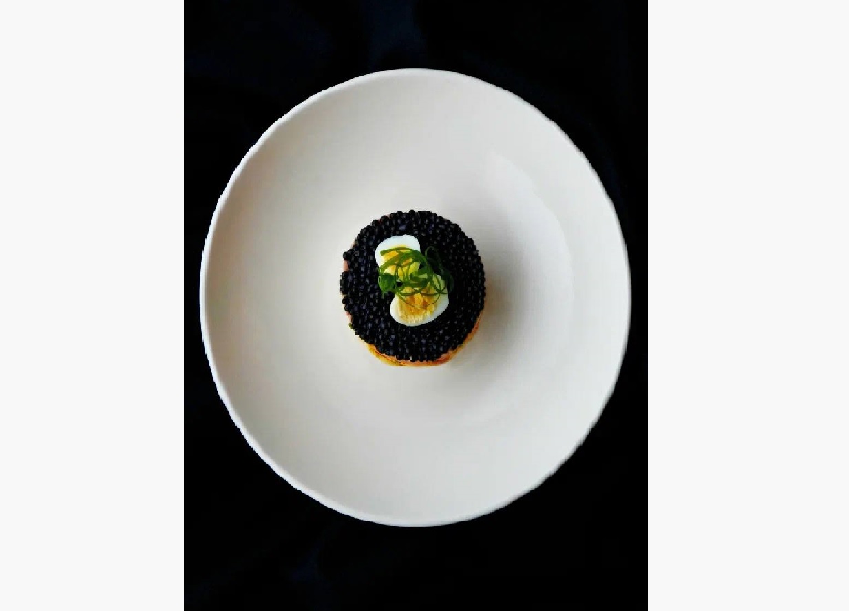Собираем салат: все ингредиенты выкладываем слоями. Удобнее всего это делать через кулинарное кольцо. Первый слой — картофель; затем — часть соуса. Второй слой — морковь; третий — тунец, а сверху — лист романо. Четвертый — яйцо и часть соуса. Пятый слой — помидоры черри; шестой — желток. Завершите сборку чёрной икрой. Украсьте перепелиным яйцом и аккуратно снимите кольцо. Для дополнительного декора используйте пепел из печёного лука — он придаст блюду необычную горечь и эффектный внешний вид.
