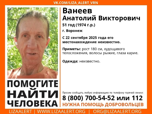Анатолий Ванеев, который приехал в Воронеж на заработки с Сахалина, пропал. Об этом корреспонденту TV Губернии рассказали волонтёры «Лизы Алерт Воронеж» в четверг, 20 ноября. 51-летний мужчина пропал ещё в сентябре, но заявку на поиски добровольцы получили только сейчас. Анатолий Ванеев перестал выходить на связь.