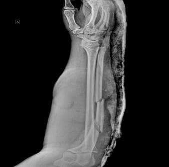 Пострадавший поступил в медучреждение с переломом локтевой кости и большой поверхностной раной. Лечение проводили в три этапа. Сначала хирурги провели первичную обработку и установили аппарат внешней фиксации, чтобы стабилизировать сломанную кость.