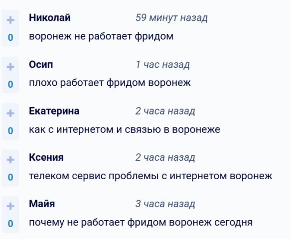 Воронежцы вновь пожаловались на помехи в работе интернета в субботу, 17 января. Жалобы о том, что не работают провайдеры Freedom и Телеком, массово появляются на различных сервисах. Пользователи отмечают, что интернет «вырубился внезапно», у многих — ещё вечером пятницы, 16 января.